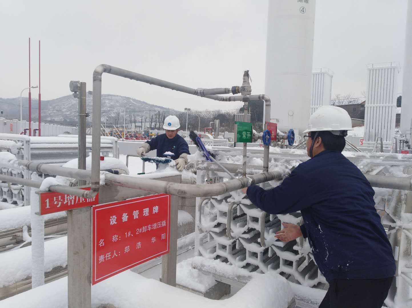 隨著低溫天氣持續(xù),我市城區(qū)日用氣量逐日攀升,12月30日已達(dá)40萬立方左右。除21萬方管輸氣外,其它氣源均需安慶港華高價購進(jìn)LNG(液化天然氣)并通過北部新城LNG應(yīng)急調(diào)峰站不間斷氣化補充。而本次降雪恰逢元旦假期,受高速限行?;泛蛧?、省道積雪等不利因素影響,有2/3的運送LNG來宜的罐車被迫滯留途中。面對多重挑戰(zhàn),安慶港華沉著應(yīng)對,一方面多方聯(lián)系附近氣源供應(yīng)商,不惜成本保供應(yīng);另一方面晝夜不間斷清掃站前及站內(nèi)車用通道,確保運氣罐車進(jìn)出暢通,并及時清除關(guān)鍵設(shè)施操作閥門(緊急切斷閥、手動低溫閥)上的積雪,確保高負(fù)荷作業(yè)情況下各制氣相關(guān)設(shè)施高效運行。