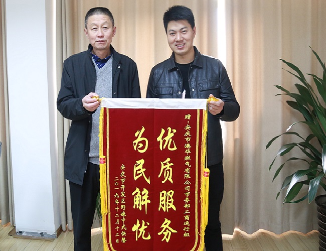 12月16日上午,市開發(fā)區(qū)野妹中式快餐負責人來到安慶港華,將一面繡有“優(yōu)質(zhì)服務(wù) 為民解憂”的錦旗,贈與公司工商運行組表示感謝。