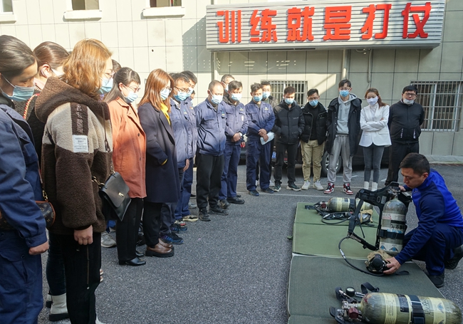 培訓(xùn)中,消防特勤中隊(duì)教官詳細(xì)講解了各消防器材的種類、性能、適用火種和操作要領(lǐng),重點(diǎn)演示了干粉滅火器的使用、消防服和空氣呼吸器的穿戴以及消防水帶的使用等,并現(xiàn)場指導(dǎo)港華員工依次進(jìn)行滅火相關(guān)實(shí)操練習(xí)。