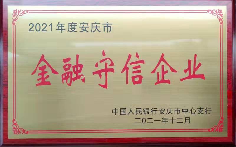 “金融守信企業(yè)”稱(chēng)號(hào)系根據(jù)《安慶市金融守信企業(yè)評(píng)定實(shí)施辦法》,經(jīng)市中級(jí)人民法院、市住建委、稅務(wù)局、工商質(zhì)監(jiān)局、環(huán)保局、公管局等部門(mén)評(píng)議,并由安慶市銀行行長(zhǎng)聯(lián)席會(huì)議評(píng)定授予。