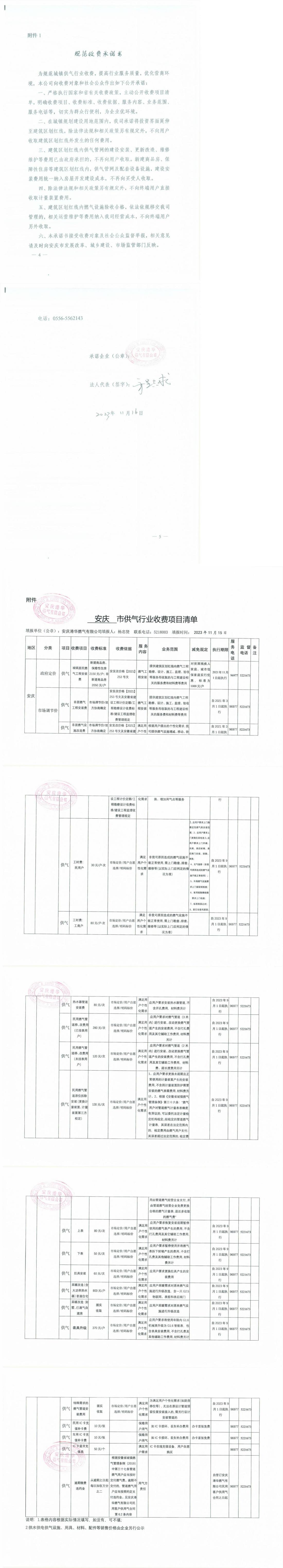 安慶港華規(guī)范收費(fèi)承諾書(含行業(yè)收費(fèi)項(xiàng)目清單及終端用氣價(jià)格表)
