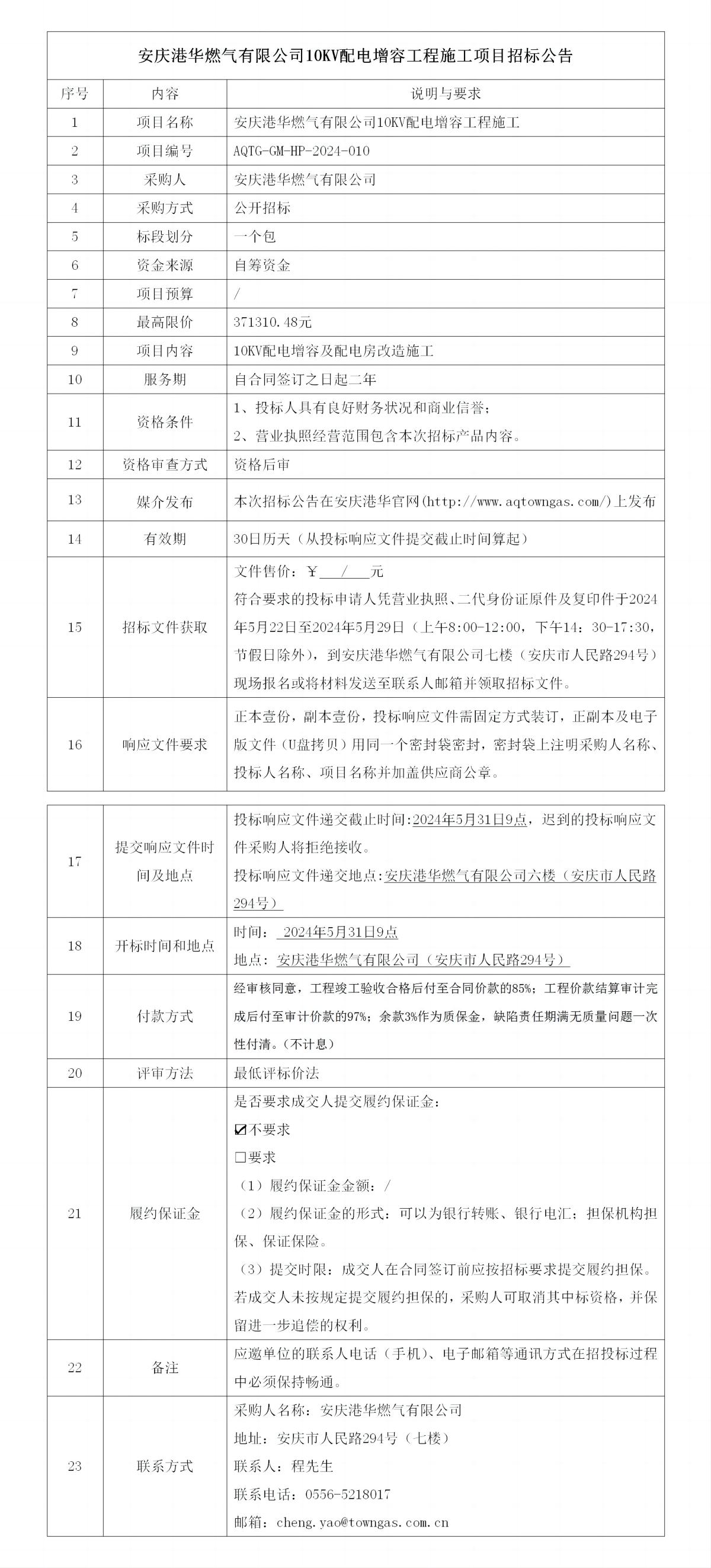 安慶港華燃?xì)庥邢薰?0KV配電增容工程施工項(xiàng)目招標(biāo)公告