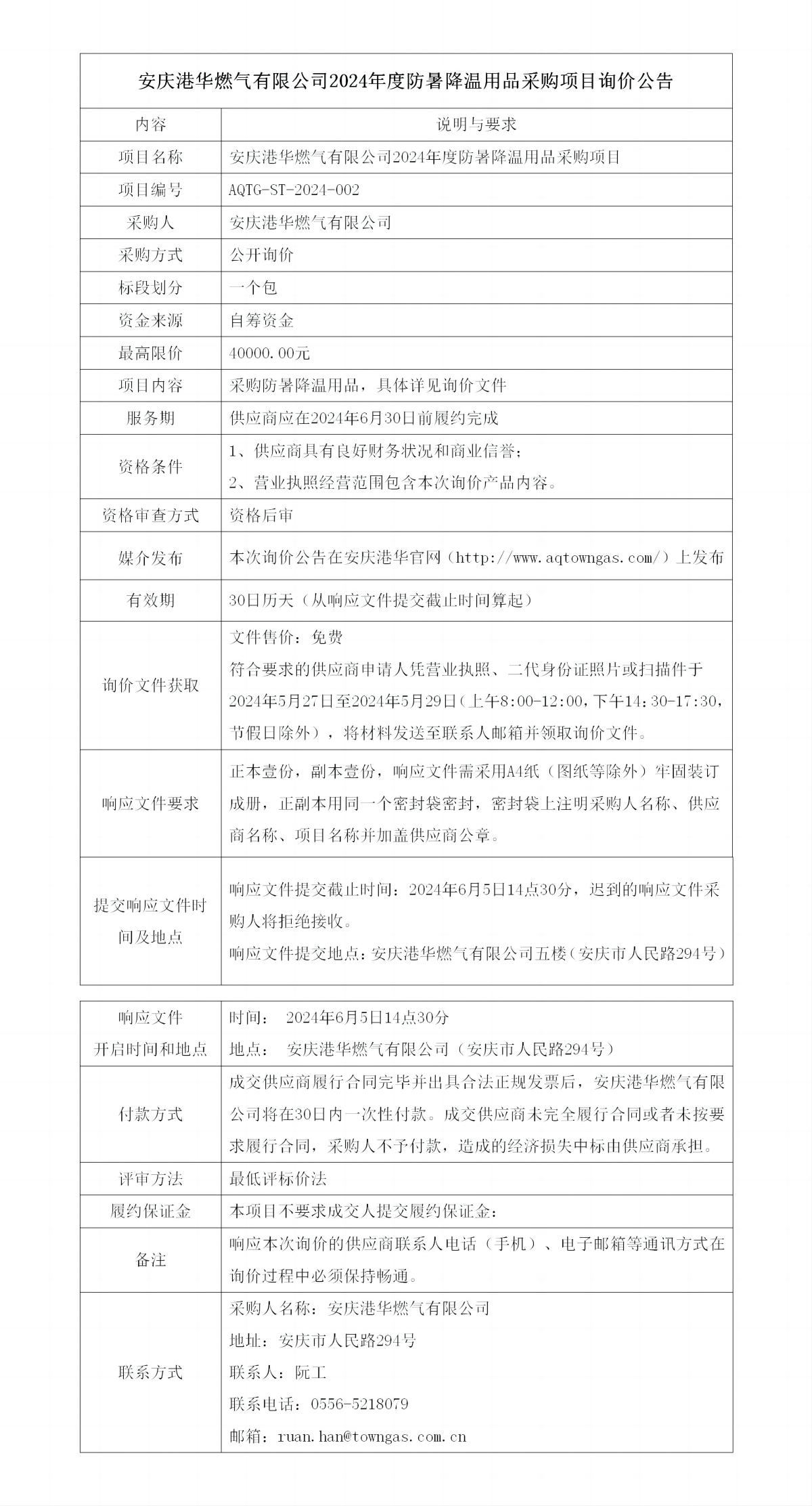 安慶港華燃氣有限公司2024年度防暑降溫用品采購項目詢價公告