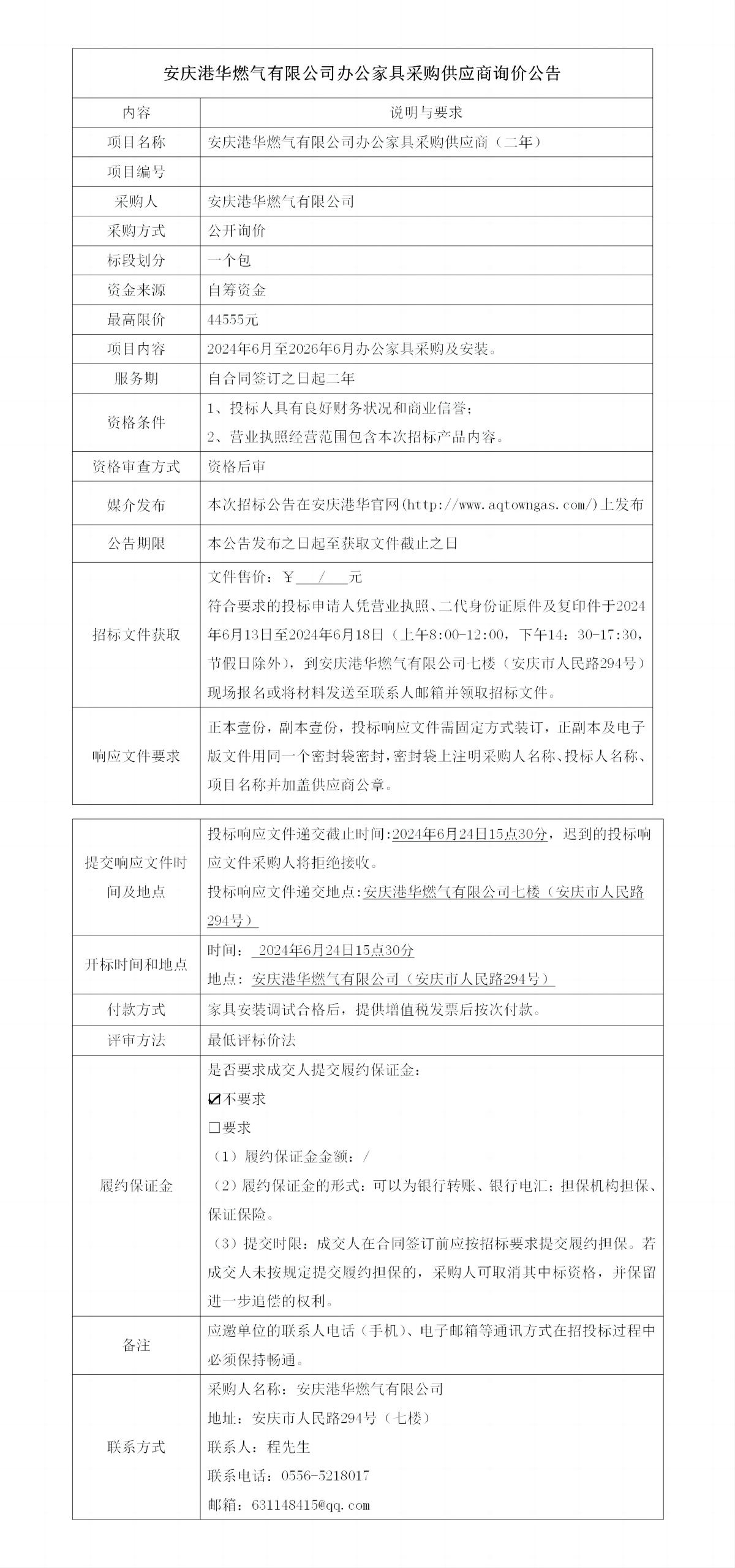 安慶港華燃?xì)庥邢薰巨k公家具采購(gòu)供應(yīng)商詢價(jià)公告
