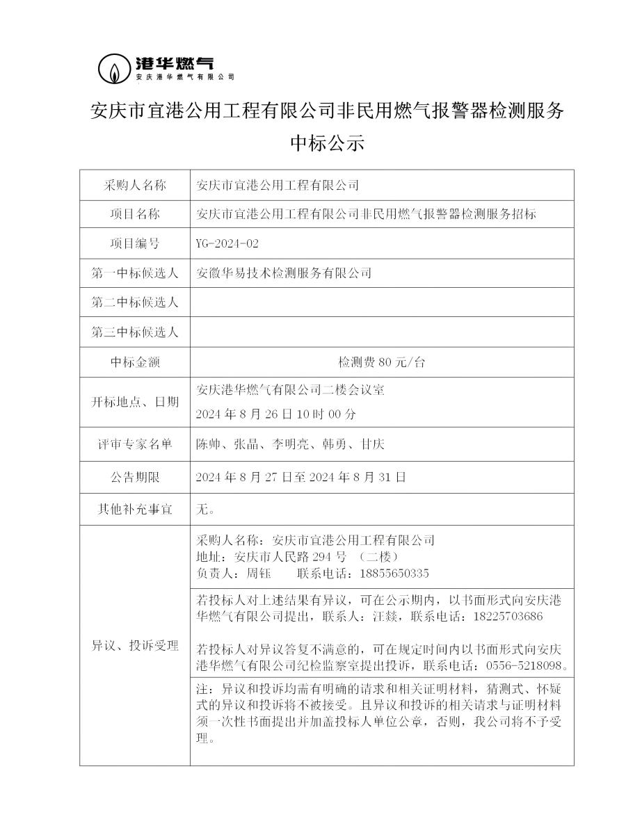 安慶市宜港公用工程有限公司非民用燃?xì)鈭?bào)警器檢測服務(wù)中標(biāo)公示