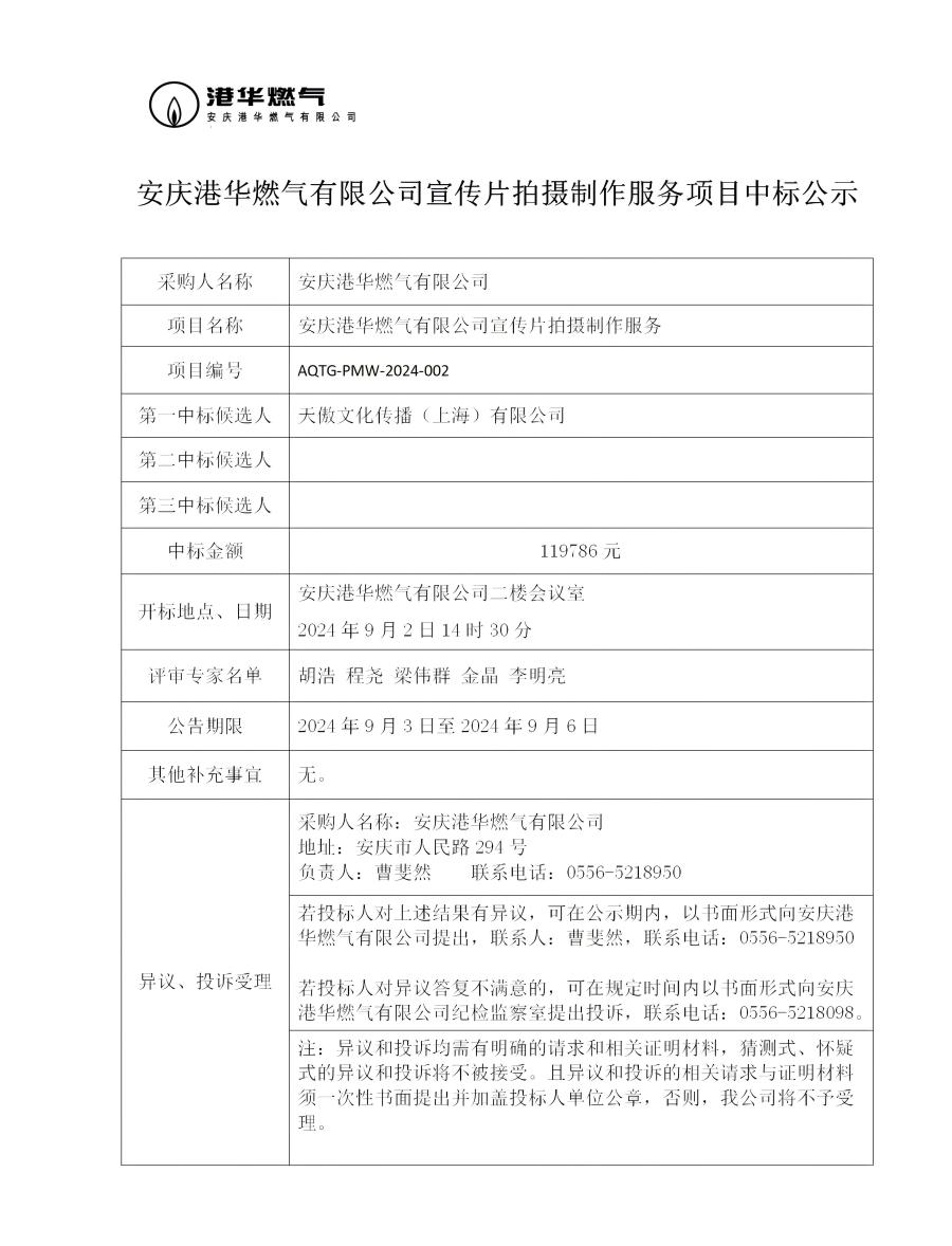 安慶港華燃氣有限公司宣傳片拍攝制作服務(wù)項目中標公示