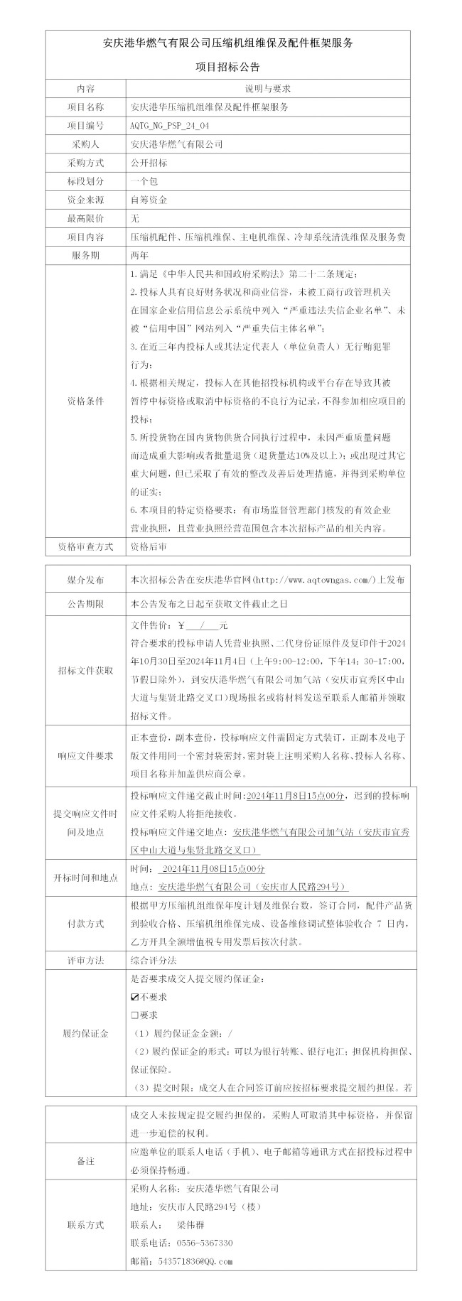 安慶港華燃?xì)庥邢薰緣嚎s機(jī)組維保及配件框架服務(wù)項(xiàng)目招標(biāo)公告