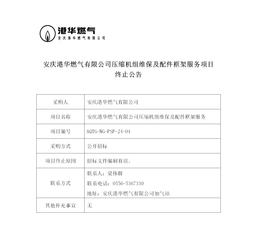 安慶港華燃氣有限公司壓縮機組維保及配件框架服務項目終止公告