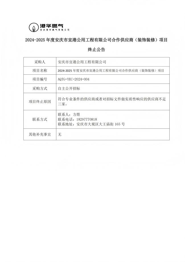 2024-2025 年度安慶市宜港公用工程有限公司合作供應商(裝飾裝修)項目終止公告