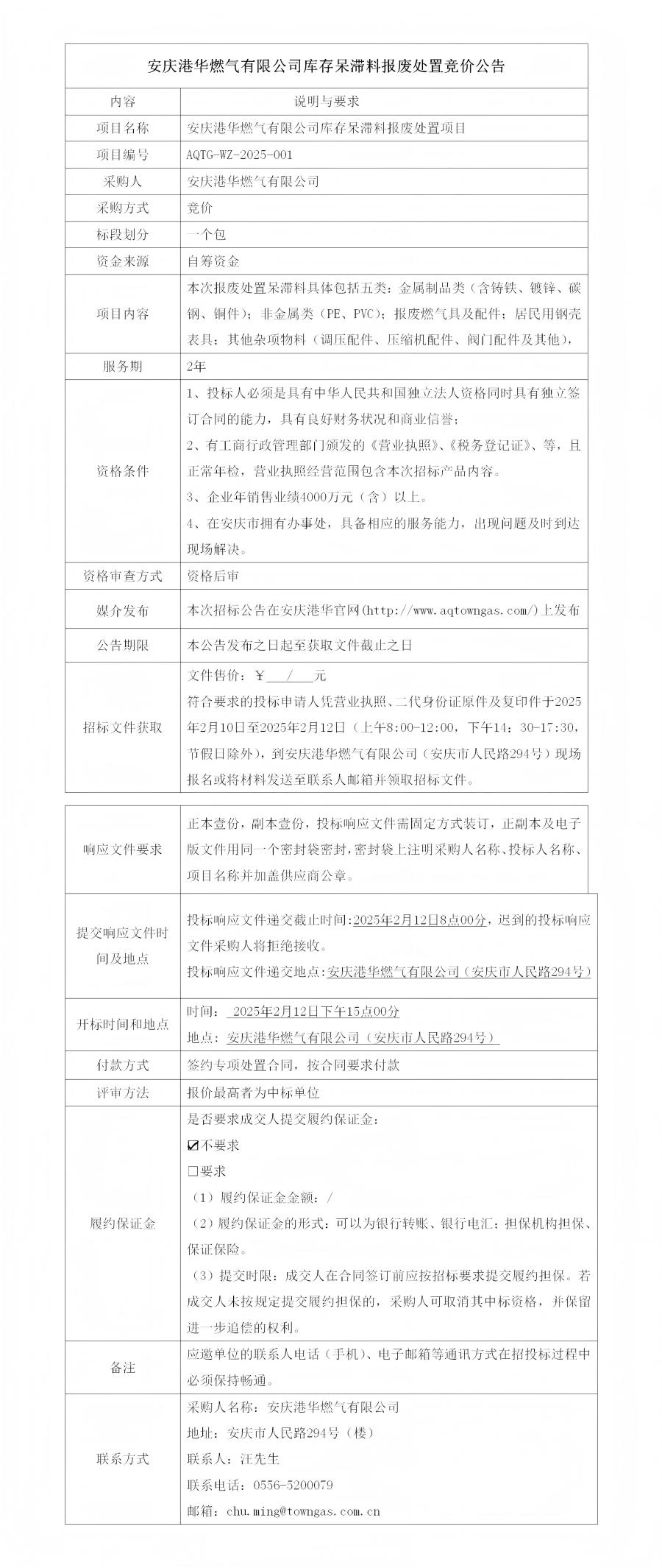 安慶港華燃氣有限公司庫存呆滯料報廢處置競價公告