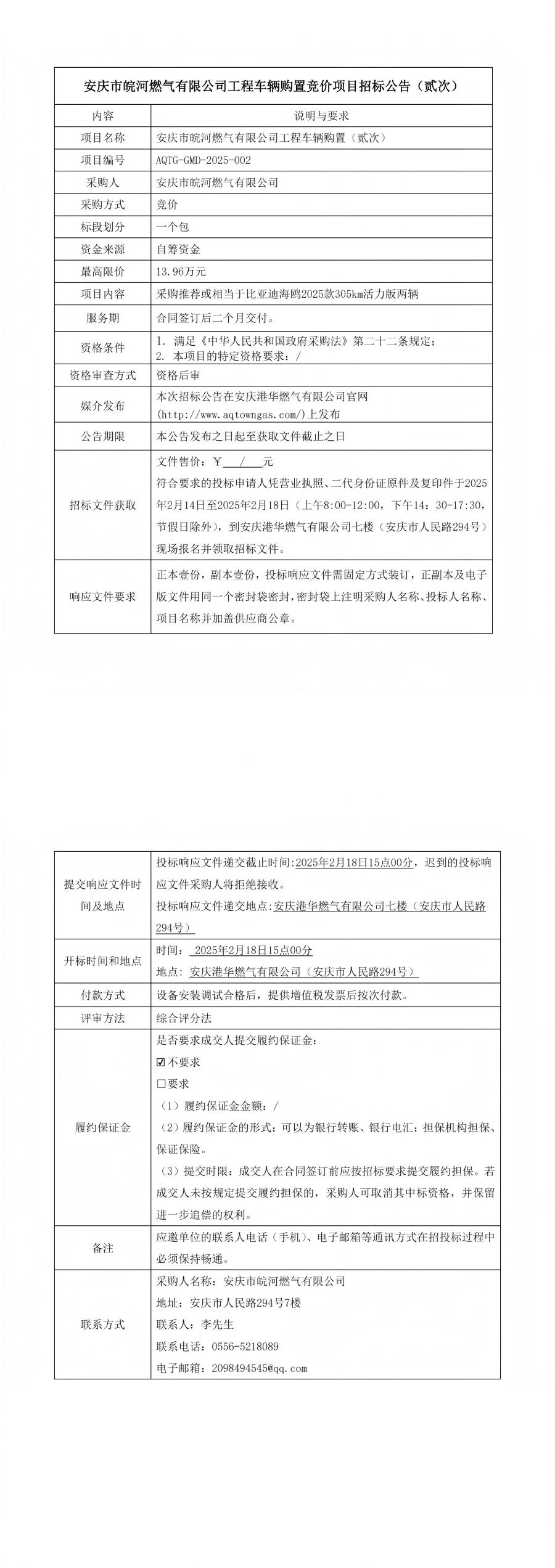 安慶市皖河燃?xì)庥邢薰竟こ誊囕v購置競價項目招標(biāo)公告(貳次)