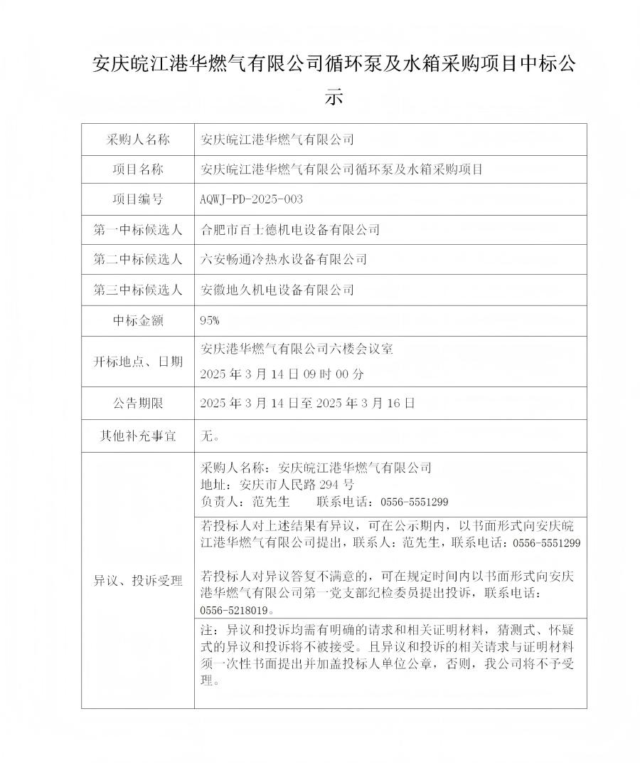 安慶皖江港華燃氣有限公司循環(huán)泵及水箱采購項目中標公示