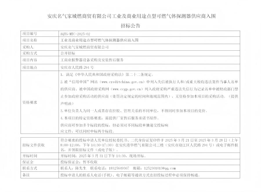 安慶名氣家城燃商貿(mào)有限公司工業(yè)及商業(yè)用途點(diǎn)型可燃?xì)怏w探測器供應(yīng)商入圍招標(biāo)公告
