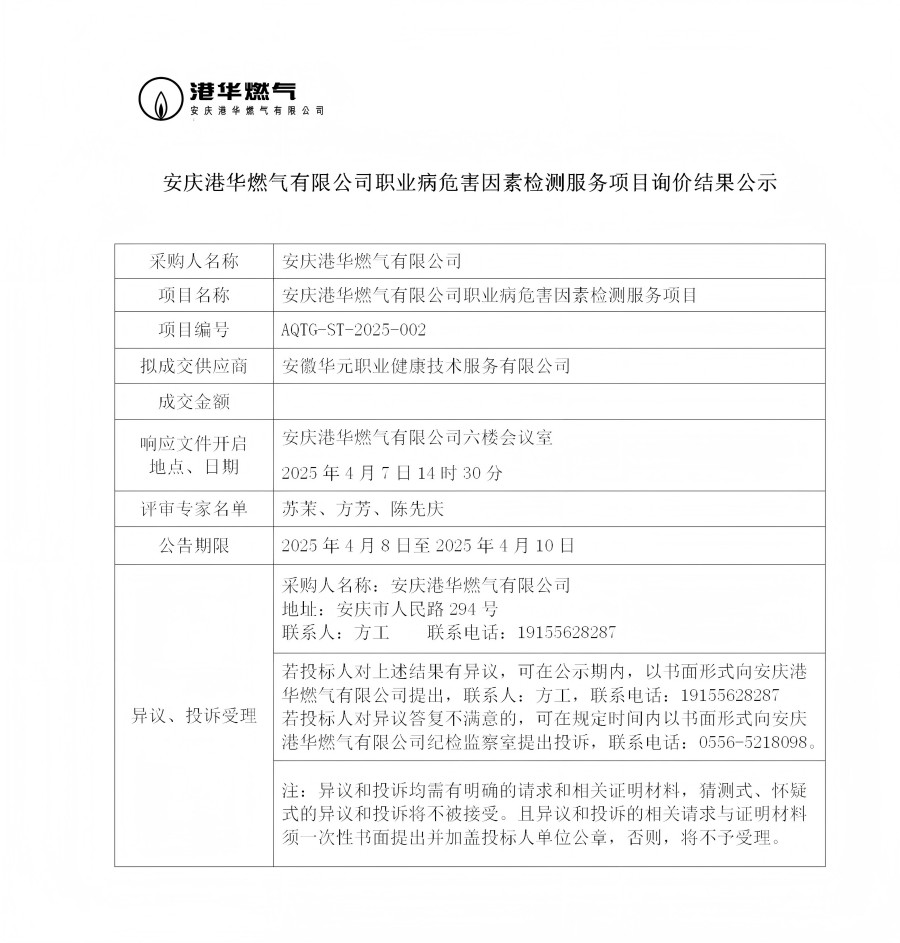 安慶港華燃氣有限公司職業(yè)病危害因素檢測服務項目詢價結(jié)果公示