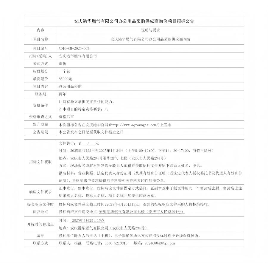 安慶港華燃氣有限公司辦公用品采購供應商詢價項目招標公告