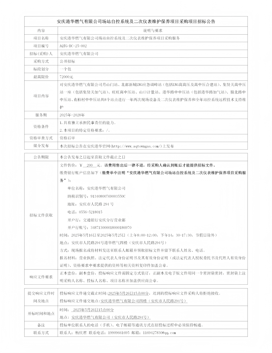 安慶港華燃氣有限公司場站自控系統(tǒng)及二次儀表維護保養(yǎng)項目采購項目招標公告