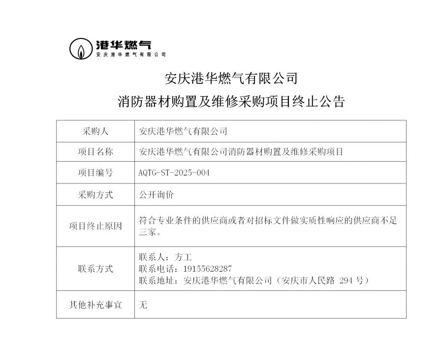 安慶港華燃?xì)庥邢薰鞠榔鞑馁徶眉熬S修采購項(xiàng)目終止公告