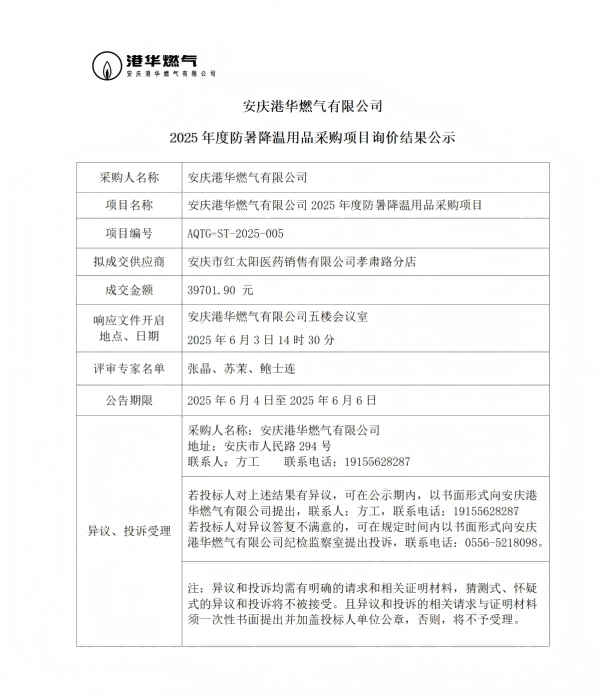 安慶港華燃氣有限公司2025年度防暑降溫用品采購項目詢價結(jié)果公示