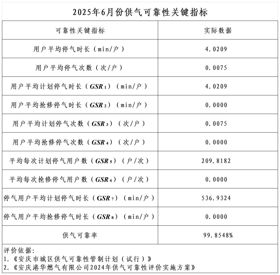 2025年6月份供氣可靠性關(guān)鍵指標