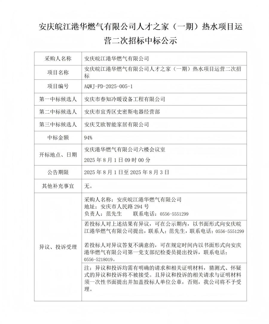 安慶皖江港華燃氣有限公司人才之家(一期)熱水項目運營二次招標中標公示