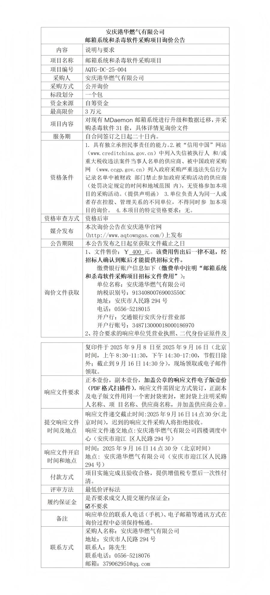 安慶港華燃?xì)庥邢薰距]箱系統(tǒng)和殺毒軟件采購項(xiàng)目詢價(jià)公告