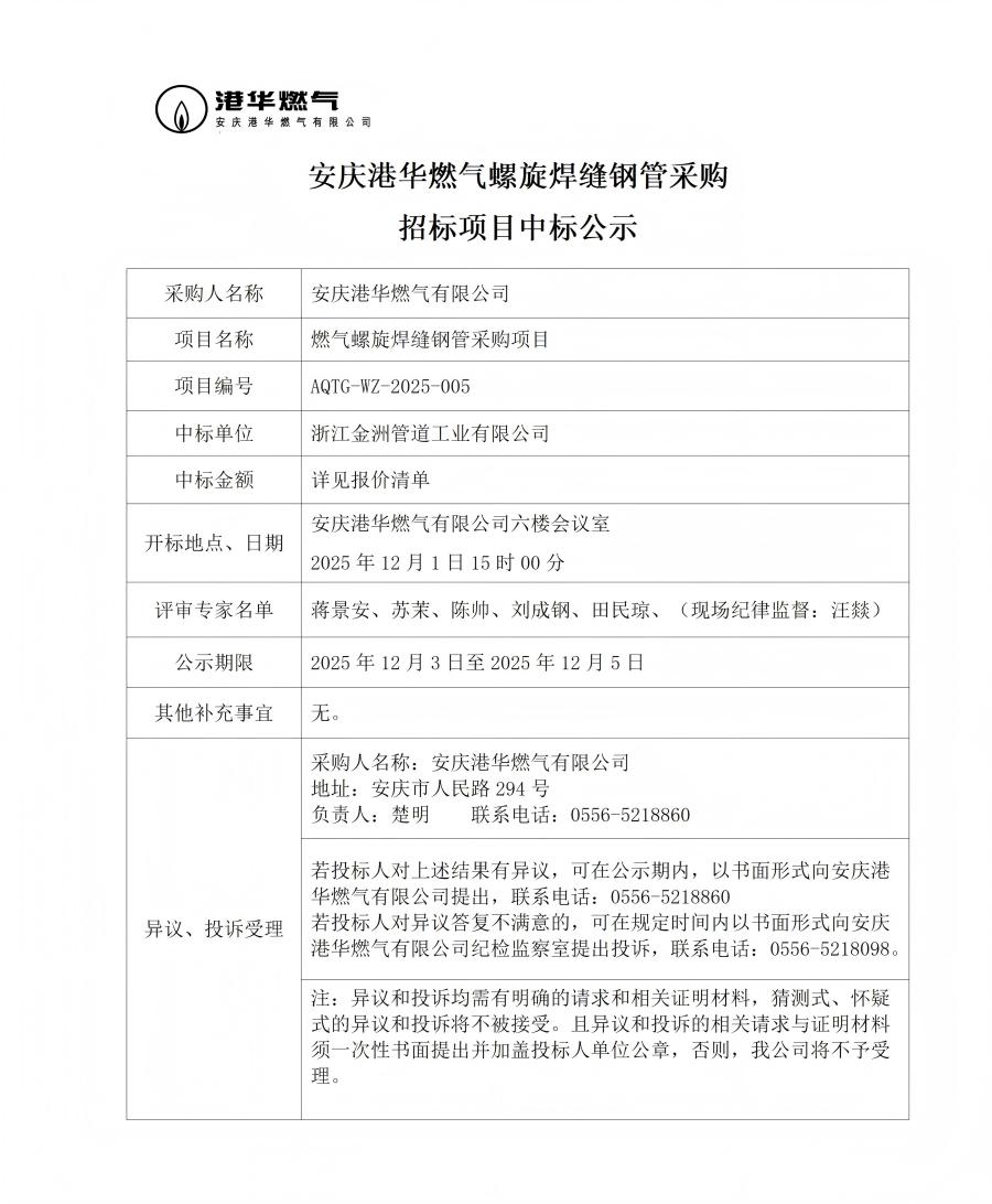 安慶港華燃氣螺旋焊縫鋼管采購招標項目中標公示