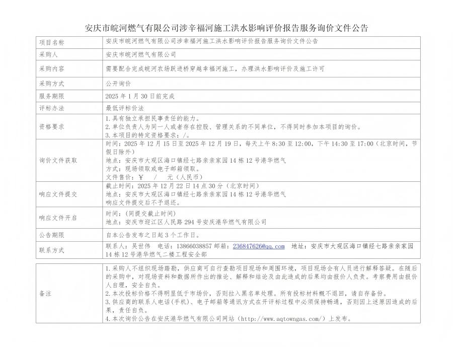 安慶市皖河燃?xì)庥邢薰旧嫘粮:邮┕ず樗绊懺u(píng)價(jià)報(bào)告服務(wù)詢價(jià)文件公告