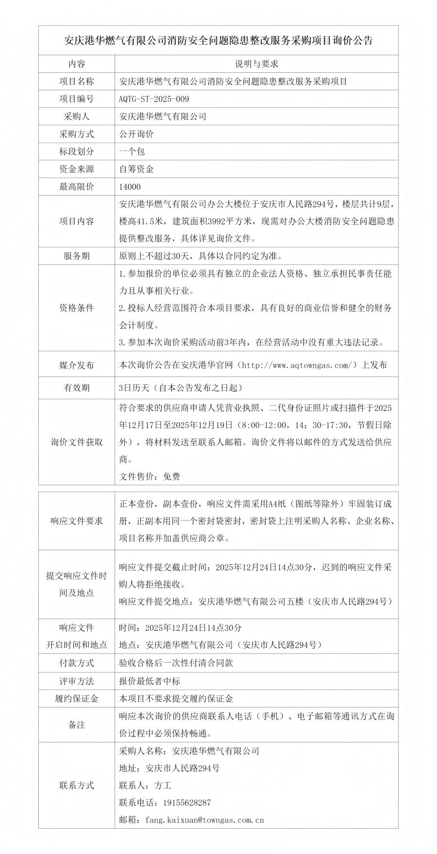 安慶港華燃?xì)庥邢薰鞠腊踩珕栴}隱患整改服務(wù)采購項目詢價公告