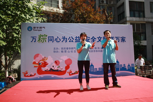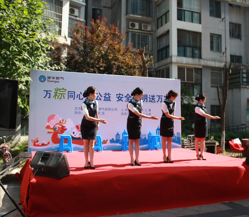 當(dāng)日,安慶港華的義工隊員和“藍(lán)焰”黨員義工們早早來到炮營山社居委轄區(qū)的諧水灣小區(qū),撐帳篷,搭展臺,搬物料,一場以“包粽子、看演出、講安全、傳文明”為主題的文化大餐陸續(xù)上演?;顒蝇F(xiàn)場熱鬧非凡,不少用戶正在港華燃?xì)獾摹傲鲃臃?wù)車”前排隊進(jìn)行燃?xì)鈭笱b和繳費(fèi),服務(wù)臺的工作人員一邊發(fā)放著燃?xì)獍踩麄魇謨?,一邊針對居民的用氣問題耐心作答。而廣場正中央搭建的演出舞臺更是吸引不少居民駐足圍觀,安慶港華燃?xì)夂蜕鐓^(qū)居民聯(lián)合打造的精彩紛呈的文藝表演正在進(jìn)行。既有優(yōu)揚(yáng)的港華企業(yè)歌曲,又有優(yōu)雅的服務(wù)禮儀表演;社區(qū)阿姨們的廣場舞,舞出了歡樂,舞出了自信,來自轄區(qū)學(xué)校孩子們有模有樣的黃梅戲表演,讓我們看到了傳統(tǒng)戲曲文化的美好傳承;穿插其間的燃?xì)獍踩R有獎問答更是引得眾人踴躍參與,掌聲、歡呼聲此起彼伏。而臺下社區(qū)阿姨和港華義工在欣賞精彩文藝演出的同時,還不忘巧手裹粽,不多會,桌上就擺滿了幾百只飄著粽葉香的愛心粽,既弘揚(yáng)了傳統(tǒng)文化,又增進(jìn)了企業(yè)和居民之間的感情,現(xiàn)場呈現(xiàn)出一片文明和諧,奮進(jìn)向上的氛圍。